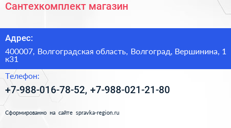 Сантехкомплект, магазин по адресу 400007, Волгоградская область, Волгоград, Вершинина, 1 к31 в дальнейшем Организация, размещена в следующих категориях: