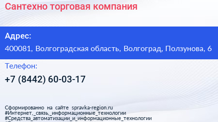 Сантехно, торговая компания по адресу 400081, Волгоградская область, Волгоград, Ползунова, 6 в дальнейшем Организация, размещена в следующих категориях: