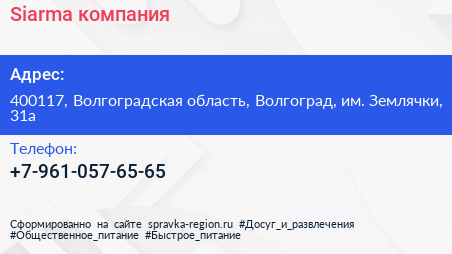 Siarma, компания по адресу 400117, Волгоградская область, Волгоград, им. Землячки, 31а в дальнейшем Организация, размещена в следующих категориях: