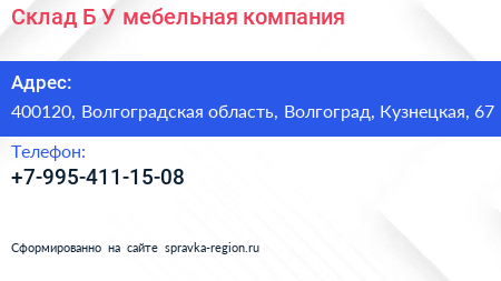 Склад Б/У, мебельная компания по адресу 400120, Волгоградская область, Волгоград, Кузнецкая, 67 в дальнейшем Организация, размещена в следующих категориях: