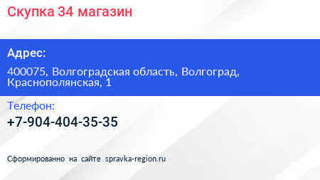 Скупка 34, магазин по адресу 400075, Волгоградская область, Волгоград, Краснополянская, 1 в дальнейшем Организация, размещена в следующих категориях: