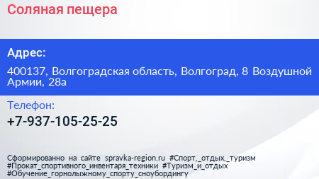 Соляная пещера по адресу 400137, Волгоградская область, Волгоград, 8 Воздушной Армии, 28а в дальнейшем Организация, размещена в следующих категориях: