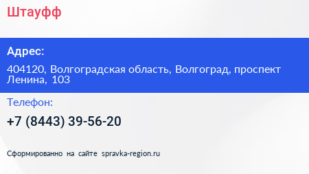 Штауфф по адресу 404120, Волгоградская область, Волгоград, проспект Ленина, 103 в дальнейшем Организация, размещена в следующих категориях:
