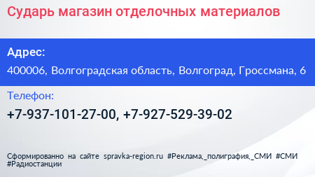 Сударь, магазин отделочных материалов по адресу 400006, Волгоградская область, Волгоград, Гроссмана, 6 в дальнейшем Организация, размещена в следующих категориях: