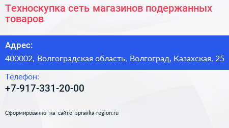 Техноскупка, сеть магазинов подержанных товаров по адресу 400002, Волгоградская область, Волгоград, Казахская, 25 в дальнейшем Организация, размещена в следующих категориях: