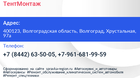 ТентМонтаж по адресу 400123, Волгоградская область, Волгоград, Хрустальная, 97а в дальнейшем Организация, размещена в следующих категориях: