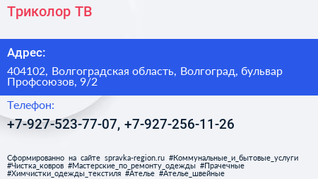 Триколор ТВ по адресу 404102, Волгоградская область, Волгоград, бульвар Профсоюзов, 9/2 в дальнейшем Организация, размещена в следующих категориях: