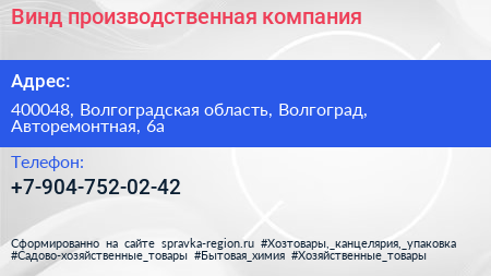 Винд, производственная компания по адресу 400048, Волгоградская область, Волгоград, Авторемонтная, 6а в дальнейшем Организация, размещена в следующих категориях: