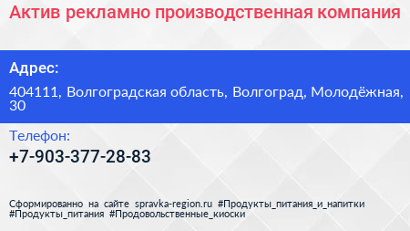 Актив, рекламно-производственная компания по адресу 404111, Волгоградская область, Волгоград, Молодёжная, 30 в дальнейшем Организация, размещена в следующих категориях: