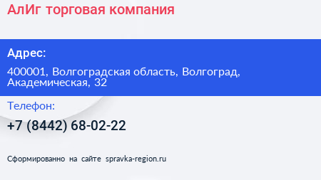 АлИг, торговая компания по адресу 400001, Волгоградская область, Волгоград, Академическая, 32 в дальнейшем Организация, размещена в следующих категориях: