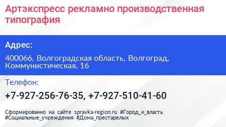 Артэкспресс, рекламно-производственная типография по адресу 400066, Волгоградская область, Волгоград, Коммунистическая, 16 в дальнейшем Организация, размещена в следующих категориях: