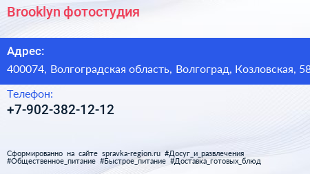 Brooklyn, фотостудия по адресу 400074, Волгоградская область, Волгоград, Козловская, 58 в дальнейшем Организация, размещена в следующих категориях: