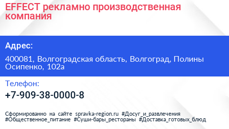 EFFECT, рекламно-производственная компания по адресу 400081, Волгоградская область, Волгоград, Полины Осипенко, 102а в дальнейшем Организация, размещена в следующих категориях: