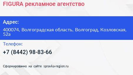 FIGURA, рекламное агентство по адресу 400074, Волгоградская область, Волгоград, Козловская, 52а в дальнейшем Организация, размещена в следующих категориях: