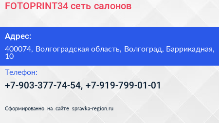 FOTOPRINT34, сеть салонов по адресу 400074, Волгоградская область, Волгоград, Баррикадная, 10 в дальнейшем Организация, размещена в следующих категориях: