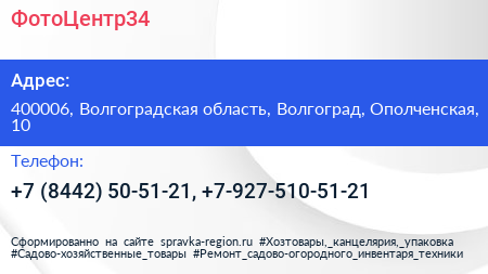 ФотоЦентр34 по адресу 400006, Волгоградская область, Волгоград, Ополченская, 10 в дальнейшем Организация, размещена в следующих категориях: