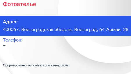 Фотоателье по адресу 400067, Волгоградская область, Волгоград, 64 Армии, 28 в дальнейшем Организация, размещена в следующих категориях: