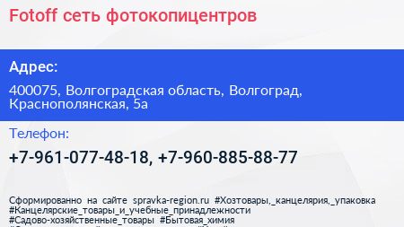 Fotoff, сеть фотокопицентров по адресу 400075, Волгоградская область, Волгоград, Краснополянская, 5а в дальнейшем Организация, размещена в следующих категориях: