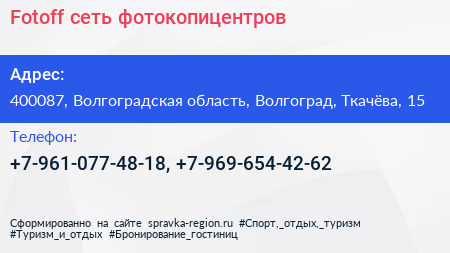 Fotoff, сеть фотокопицентров по адресу 400087, Волгоградская область, Волгоград, Ткачёва, 15 в дальнейшем Организация, размещена в следующих категориях: