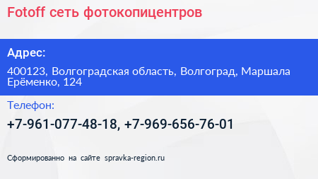 Fotoff, сеть фотокопицентров по адресу 400123, Волгоградская область, Волгоград, Маршала Ерёменко, 124 в дальнейшем Организация, размещена в следующих категориях: