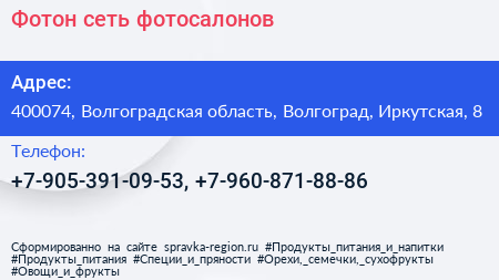 Фотон, сеть фотосалонов по адресу 400074, Волгоградская область, Волгоград, Иркутская, 8 в дальнейшем Организация, размещена в следующих категориях: