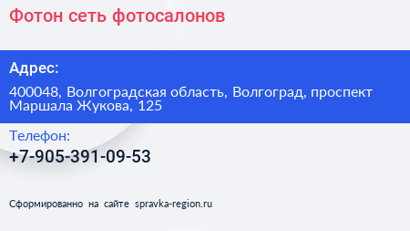 Фотон, сеть фотосалонов по адресу 400048, Волгоградская область, Волгоград, проспект Маршала Жукова, 125 в дальнейшем Организация, размещена в следующих категориях: