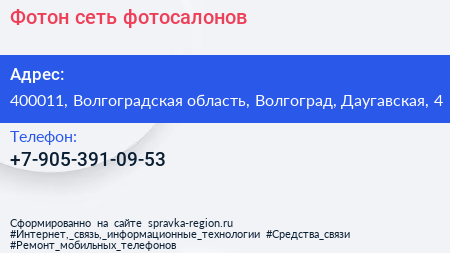 Фотон, сеть фотосалонов по адресу 400011, Волгоградская область, Волгоград, Даугавская, 4 в дальнейшем Организация, размещена в следующих категориях: