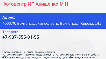 Фотоцентр, ИП Анищенко М.Н. по адресу 400079, Волгоградская область, Волгоград, Кирова, 145 в дальнейшем Организация, размещена в следующих категориях: