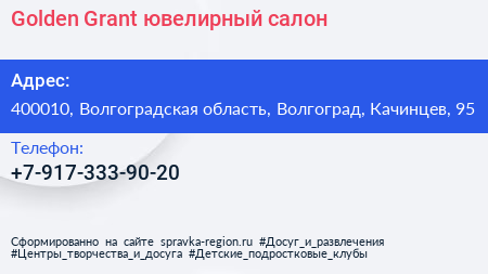 Golden Grant, ювелирный салон по адресу 400010, Волгоградская область, Волгоград, Качинцев, 95 в дальнейшем Организация, размещена в следующих категориях: