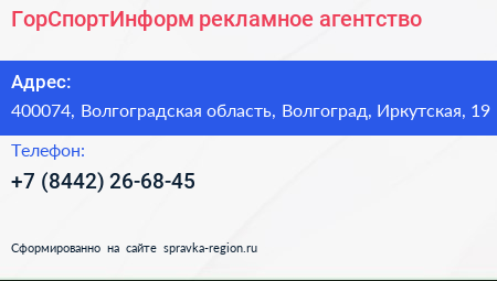 ГорСпортИнформ, рекламное агентство по адресу 400074, Волгоградская область, Волгоград, Иркутская, 19 в дальнейшем Организация, размещена в следующих категориях: