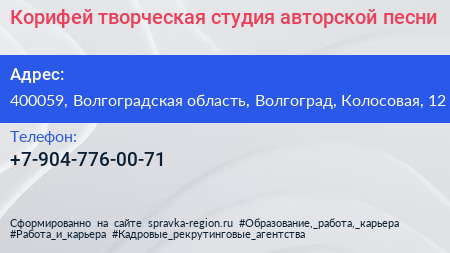 Корифей, творческая студия авторской песни по адресу 400059, Волгоградская область, Волгоград, Колосовая, 12 в дальнейшем Организация, размещена в следующих категориях: