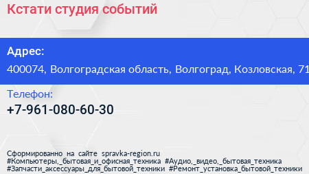 Кстати, студия событий по адресу 400074, Волгоградская область, Волгоград, Козловская, 71 в дальнейшем Организация, размещена в следующих категориях: