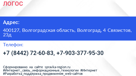 ЛОГОС по адресу 400127, Волгоградская область, Волгоград, 4 Связистов, 23д в дальнейшем Организация, размещена в следующих категориях:
