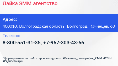 Лайка, SMM-агентство по адресу 400010, Волгоградская область, Волгоград, Качинцев, 63 в дальнейшем Организация, размещена в следующих категориях: