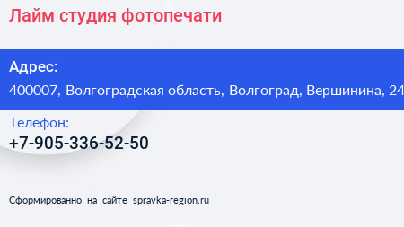 Лайм, студия фотопечати по адресу 400007, Волгоградская область, Волгоград, Вершинина, 24 в дальнейшем Организация, размещена в следующих категориях: