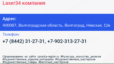 Laser34, компания по адресу 400087, Волгоградская область, Волгоград, Невская, 12в в дальнейшем Организация, размещена в следующих категориях: