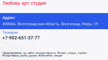 Любовь, арт-студия по адресу 400066, Волгоградская область, Волгоград, Мира, 19 в дальнейшем Организация, размещена в следующих категориях: