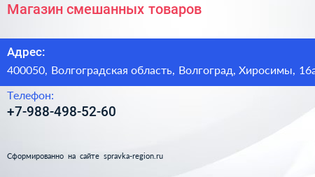 Магазин смешанных товаров по адресу 400050, Волгоградская область, Волгоград, Хиросимы, 16а в дальнейшем Организация, размещена в следующих категориях: