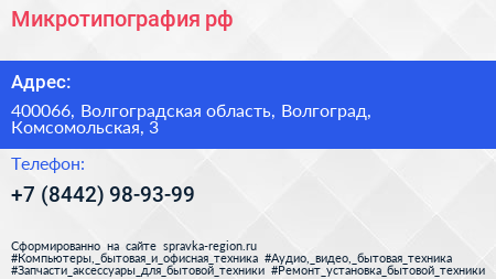 Микротипография.рф по адресу 400066, Волгоградская область, Волгоград, Комсомольская, 3 в дальнейшем Организация, размещена в следующих категориях: