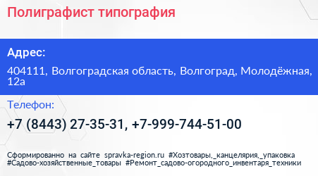 Полиграфист, типография по адресу 404111, Волгоградская область, Волгоград, Молодёжная, 12а в дальнейшем Организация, размещена в следующих категориях: