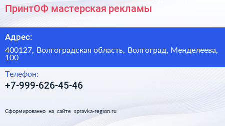 ПринтОФ, мастерская рекламы по адресу 400127, Волгоградская область, Волгоград, Менделеева, 100 в дальнейшем Организация, размещена в следующих категориях: