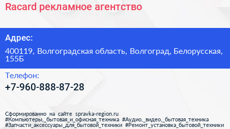 Racard, рекламное агентство по адресу 400119, Волгоградская область, Волгоград, Белорусская, 155Б в дальнейшем Организация, размещена в следующих категориях: