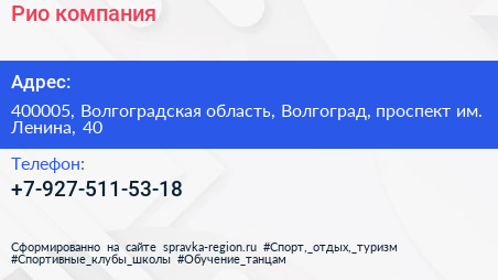 Рио, компания по адресу 400005, Волгоградская область, Волгоград, проспект им. Ленина, 40 в дальнейшем Организация, размещена в следующих категориях: