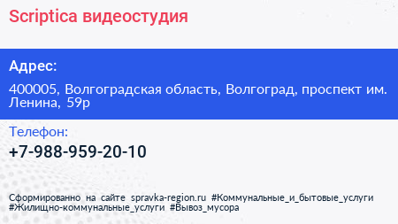 Scriptica, видеостудия по адресу 400005, Волгоградская область, Волгоград, проспект им. Ленина, 59р в дальнейшем Организация, размещена в следующих категориях: