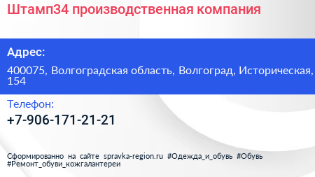 Штамп34, производственная компания по адресу 400075, Волгоградская область, Волгоград, Историческая, 154 в дальнейшем Организация, размещена в следующих категориях: