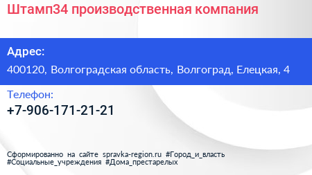 Штамп34, производственная компания по адресу 400120, Волгоградская область, Волгоград, Елецкая, 4 в дальнейшем Организация, размещена в следующих категориях:
