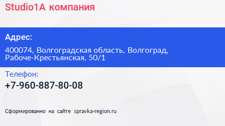 Studio1A, компания по адресу 400074, Волгоградская область, Волгоград, Рабоче-Крестьянская, 50/1 в дальнейшем Организация, размещена в следующих категориях: