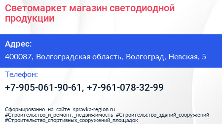 Светомаркет, магазин светодиодной продукции по адресу 400087, Волгоградская область, Волгоград, Невская, 5 в дальнейшем Организация, размещена в следующих категориях:
