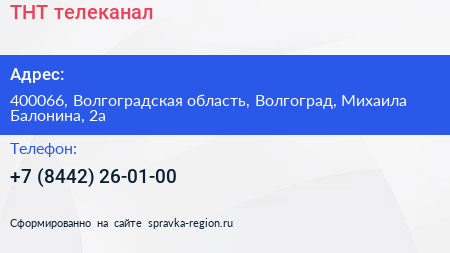 ТНТ, телеканал по адресу 400066, Волгоградская область, Волгоград, Михаила Балонина, 2а в дальнейшем Организация, размещена в следующих категориях: