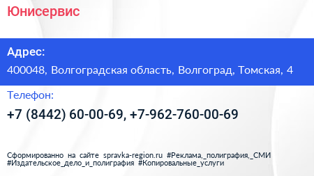 Юнисервис по адресу 400048, Волгоградская область, Волгоград, Томская, 4 в дальнейшем Организация, размещена в следующих категориях: